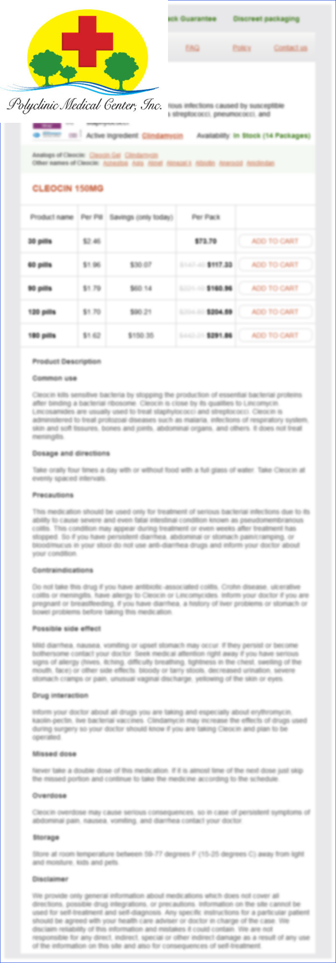 Cleocin packs: 30 pills, 60 pills, 90 pills, 120 pills, 180 pills