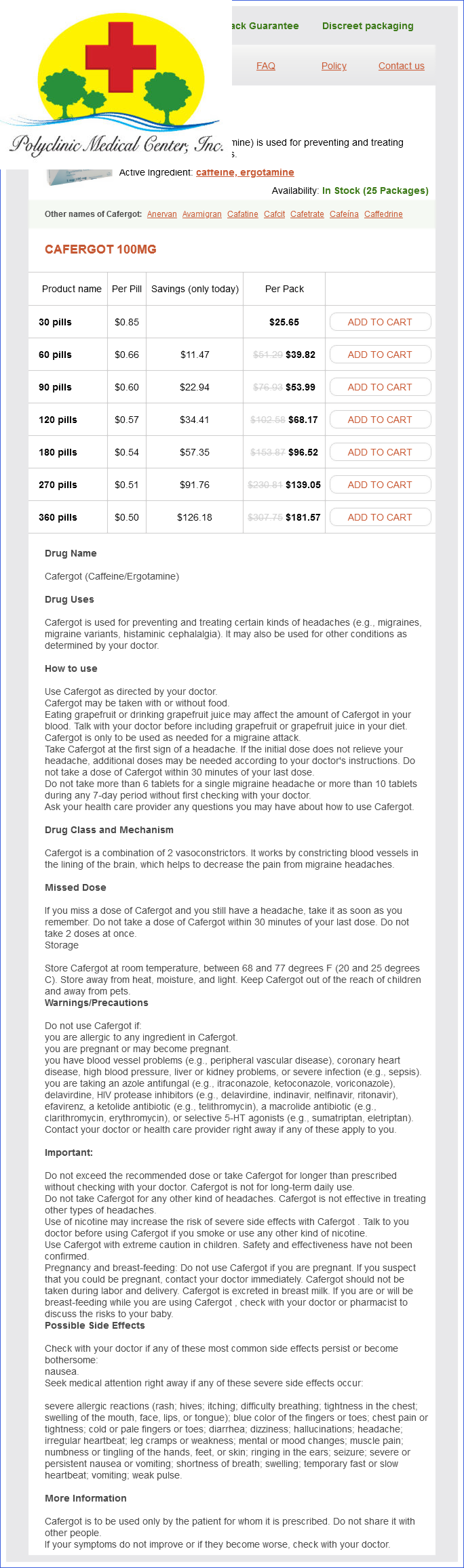 Cafergot packs: 30 pills, 60 pills, 90 pills, 120 pills, 180 pills, 270 pills, 360 pills