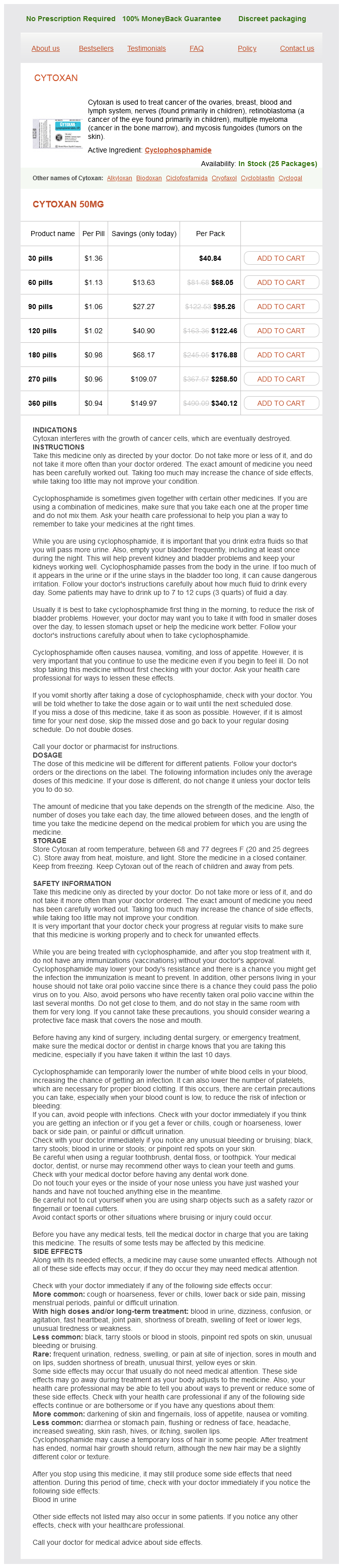 Cytoxan packs: 30 pills, 60 pills, 90 pills, 120 pills, 180 pills, 270 pills, 360 pills