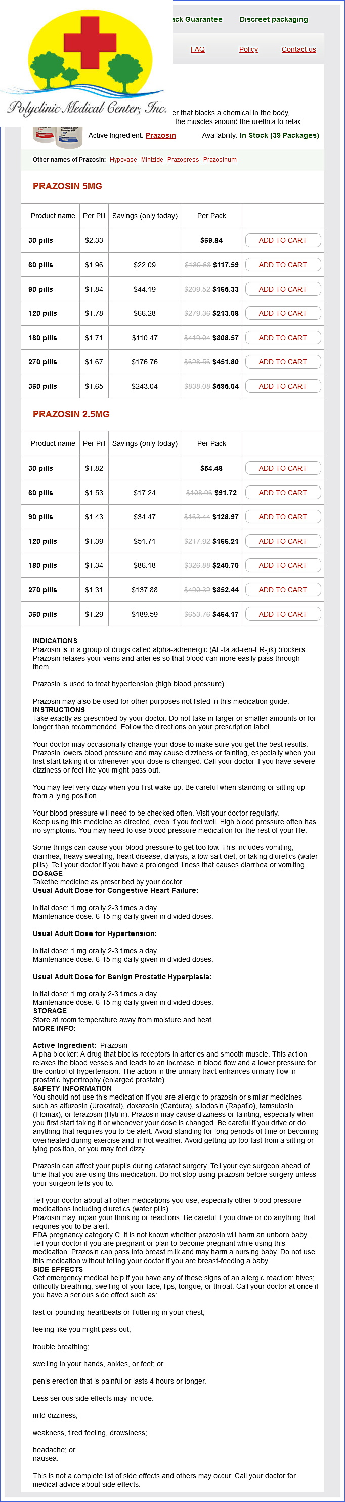 Instruct female patients to immediately notify health care professional if pregnancy is planned or suspected cholesterol in eggs bad for you generic prazosin 2.5 mg buy on line. Emphasize importance of follow-up appointments, and lab tests to evaluate effectiveness. Before starting benzafibrate, every attempt should be made to obtain a normal triglyceride level with diet, exercise and weight loss. If gallbladder studies are indicated, and gallstones are found, discontinue therapy. Lab Test Considerations: Monitor serum lipids prior to and periodically during therapy. Indications Subcutaneous injection- Initial and maintenance palliative treatment of advanced hormone-dependent prostate cancer (usually given with an anti-androgen). Nasal solution- Maintenance palliative treatment of advanced hormone-dependent prostate cancer (usually given with an anti-androgen). Nasal solution- Non-surgical treatment of endometriosis (course of treatment 6 9 mo). Chronic use results in inhibited secretion of gonadotropin release and gonadal steroid production. Pharmacokinetics Absorption: Subcut- 70%; intranasal- 1 3%; implant- drug is slowly absorbed over 2 3 mo. Patient/Family Teaching Distribution: Accumulates in liver, kidneys and anterior pituitary lobe; enters breast milk in small amounts. Advise patient that medication should be taken in conjunction with diet restrictions of fat, cholesterol, carbohydrates, and alcohol, as well as an exercise regimen, and cessation of smoking. Instruct patient to notify health care professional of unexplained muscle pain or weakness, tiredness, fever, nausea, vomiting, abdominal pain. Monitor intake and output ratios and assess for bladder distention in patients with urinary tract obstruction during initiation of therapy. Amenorrhea usually occurs within 8 wk of initial administration and menses usually resume 8 wk after completion. Lab Test Considerations: During treatment male patients should have blood tests every 3 mo to measure testosterone levels. When treatment begins, testosterone levels can temporarily markedly increase and patients may need another medication to decrease levels. Monitor blood glucose in patients with diabetes frequently; may affect blood glucose levels. Potential Nursing Diagnoses Sexual dysfunction Potential Nursing Diagnoses Disturbed body image Implementation Prostate Cancer Subcut: Only use syringes that come with kit for accurate dose. Inject into fatty tissue of abdomen, arm, or leg 3 times a day for 7 days; then daily during maintenance. Intranasal: When used as maintenance, begin nasal spray in each nostril 3 times daily.