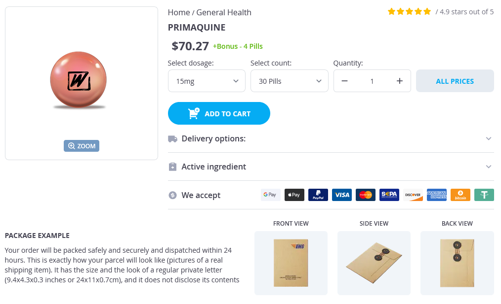 Primaquine packs: 30 pills, 60 pills, 90 pills, 120 pills, 180 pills, 240 pills, 300 pills