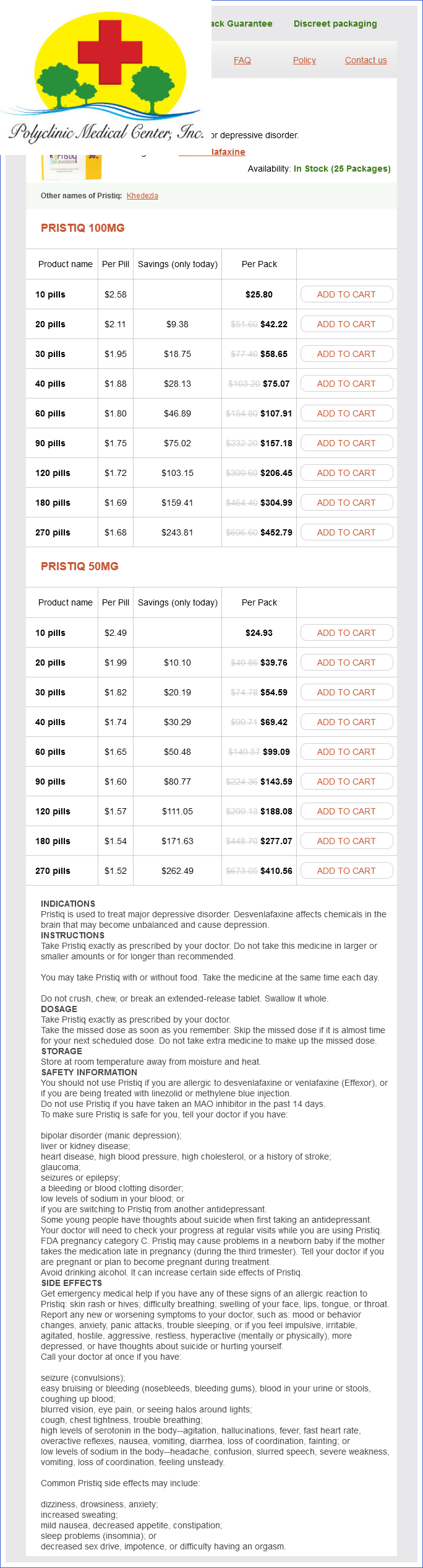Pristiq packs: 10 pills, 20 pills, 30 pills, 40 pills, 60 pills, 90 pills, 120 pills, 180 pills, 270 pills