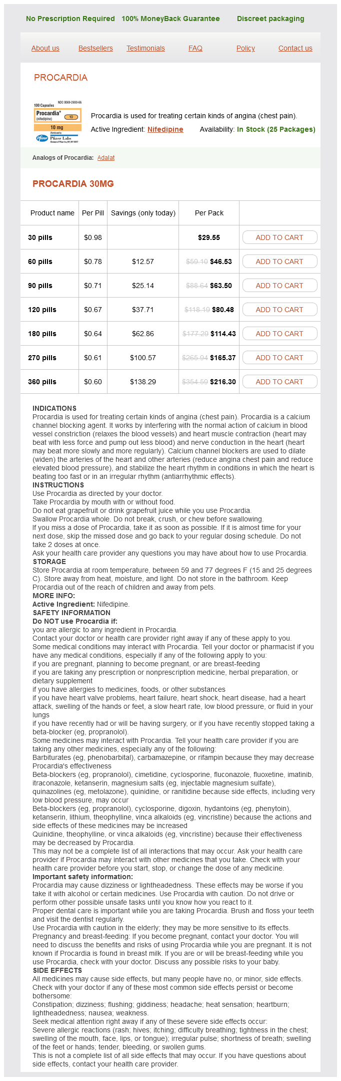 Procardia packs: 30 pills, 60 pills, 90 pills, 120 pills, 180 pills, 270 pills, 360 pills