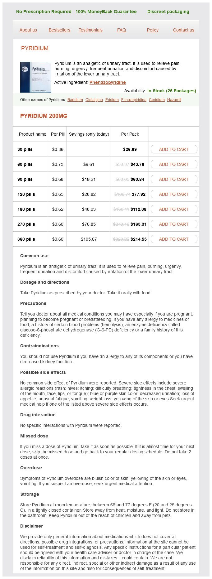 Several available drugs produce this effect chronic gastritis biopsy buy pyridium 200 mg online, such as lithium and the antibiotic demeclocycline, but these drugs are rarely used for this purpose in practice. Conivaptan and an orally active congener, tolvaptan, have been approved more recently for the treatment of acute hyponatremia. Pharmacologic effects In contrast to the other drugs, which are administered in small amounts to block transporters, mannitol is administered intravenously in gram quantities (typically 50 to 200 g over a 24-hour period) and functions as an impermeable solute in the extracellular space. By selectively increasing the osmolality of the extracellular space, water is extracted from the intracellular space to equilibrate the osmotic differences. Mannitol is freely filtered at the glomerulus, is poorly reabsorbed (<10%), and is not secreted. In contrast to the other diuretics discussed here, mannitol selectively decreases intracellular volume (Na+ and Cl- excretion are also increased, however). Absorption, fate, and excretion Mannitol must be administered intravenously to exert its diuretic effects. When administered to treat cerebral edema, decreases in intracerebral volume are seen within 15 minutes, and diuresis is evident within 1 to 3 hours. There is little metabolism of mannitol, and it is excreted in the urine with a half-time for elimination of 70 to 100 minutes. Maintaining the flow of urine during the oliguric phase of acute renal failure can block the progression of acute renal failure to irreversible chronic renal failure. This effect can also be harnessed to hasten the elimination of toxins from the body that can be trapped in the urine. Second, by extracting intracellular water, mannitol can be administered to decrease brain edema and intracranial pressure. The increase in free water clearance increases urine volume, decreases urine osmolality, reduces plasma volume, and increases plasma osmolality, primarily because of an increase in Na+ concentration. These actions make conivaptan and tolvaptan particularly suited for the treatment of hyponatremia. Therapeutic uses Conivaptan was originally approved for the treatment of euvolemic hyponatremia in hospitalized patients. These drugs are useful primarily in the treatment of the syndrome of inappropriate antidiuresis and the hyponatremia of congestive heart failure that is resistant to water restriction. Conivaptan can be used only in hospitalized patients because it is administered intravenously, and tolvaptan also must always be started (or re-started) in the hospital because careful monitoring of the plasma sodium concentration is imperative during therapy. Conivaptan is administered for a few days while tolvaptan can be administered for up to 30 days. Absorption, fate, and excretion Conivaptan is available only for intravenous administration.