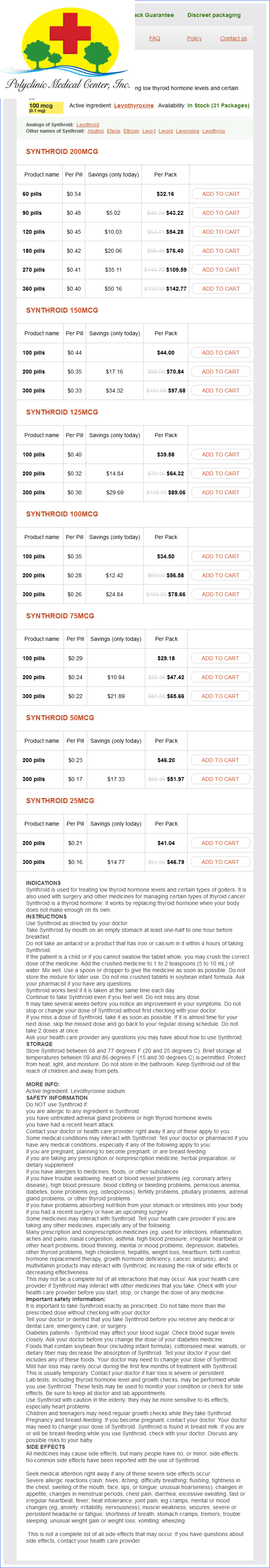 Synthroid dosages: 200 mcg, 125 mcg, 100 mcg, 75 mcg, 50 mcg, 25 mcg